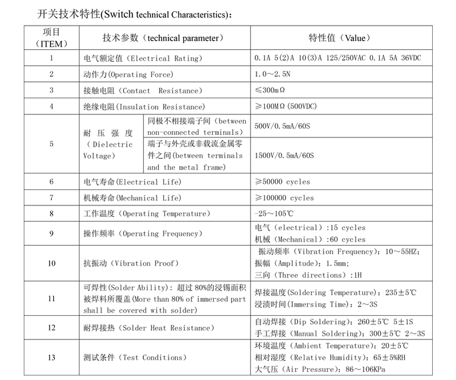 | 1 | विद्युत मूल्यांकन | 0.1ए 5(2)ए 10(3)ए 125/250वीएसी 0.1ए 5ए 36वीडीसी | |